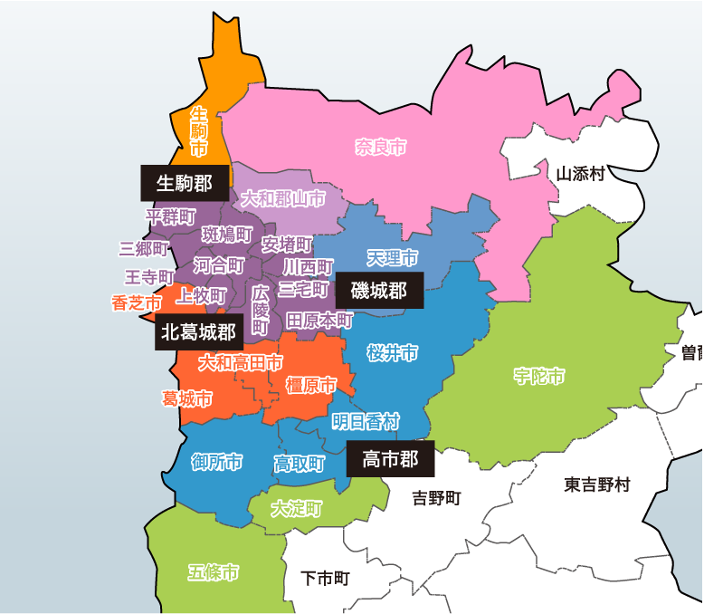 生駒郡(安堵町・斑鳩町・三郷町・平群町)・北葛城郡(王寺町・河合町・上牧町・広陵町)・磯城郡(川西町・田原本町・三宅町)